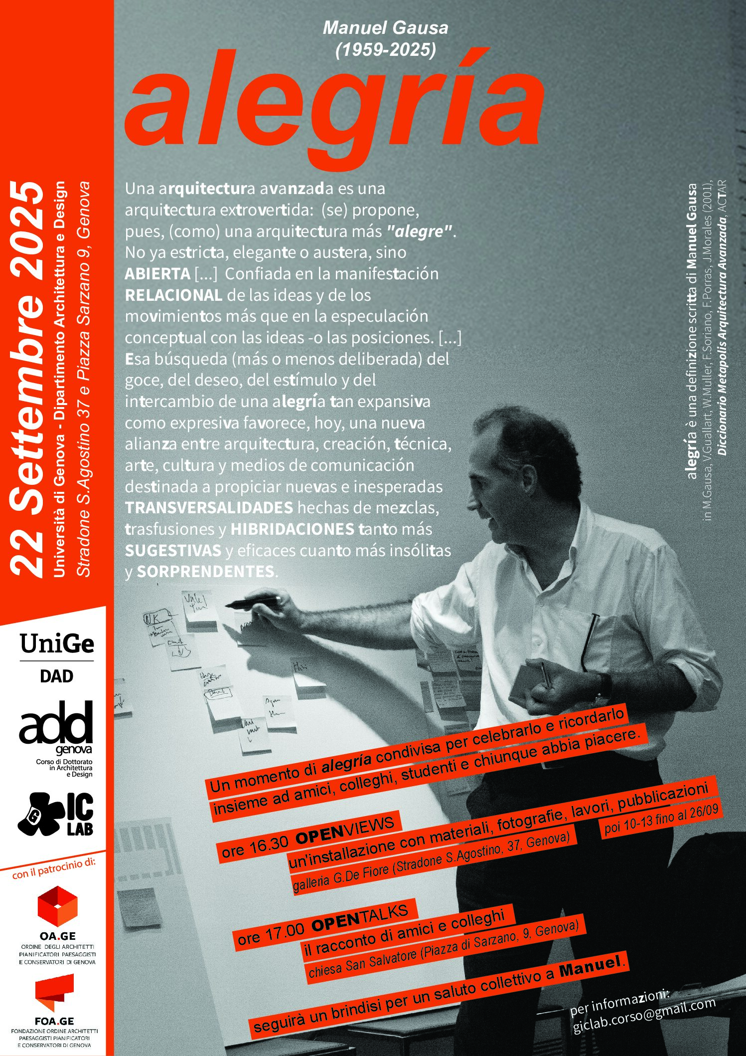 Il 22 settembre presso il Dipartimento di Architettura e Design dell’Università di Genova, si terrà un momento per celebrare e ricordare Manuel Gausa insieme ad amici, colleghi, studenti e chiunque abbia piacere. L’evento è organizzato dal Dipartimento DAD, dal Dottorato ADD, e il Cluster di ricerca GIC.lab fondato da Gausa. L’Ordine e la Fondazione degli Architetti PPC di Genova patrocinano l’evento Alegría.